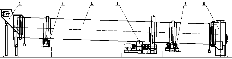 單筒冷卻機結構與單筒烘干機結構類似。主要有:1、進料裝置、2、托輪裝置3、筒體部分4、傳動部分5、托擋輪裝置6、出料裝置等組成。